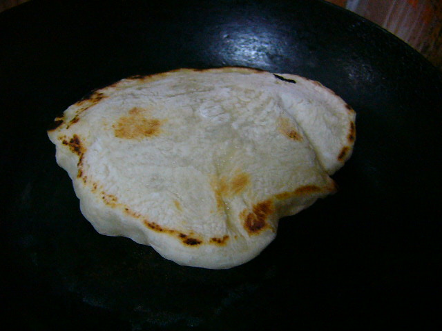 煙が出るぐらいまで予熱したら中火に落として生地を入れてしばし待つ。あちらこちらがぽこぽこ膨らみ始めたら、頃合いを見てひっくりかえす。膨らんでいるところを乾いたタオルとかで抑える。すると空気が膨らんでいない部分に移動して全体が膨らむ!そうか~あのテレビで言ってたのはこのことか!!