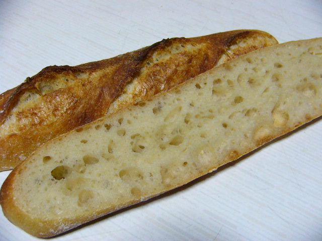 クープは半端にしか開かず、イマイチでした。今回の目的は、水分が高いわけでもなく、酵素が強い粉でもなさそうなこのフランスパンで、どの程度穴ぼこになるのか、確かめたかったってことなんですが、クラムだけでなく、パン全体としても、イマイチかな。穴ぼこ少しありますが、中心にもできていてほしいものです。