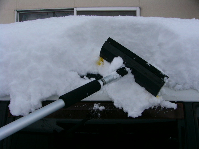 上に乗っかってる雪は、急いでいるときは乗っけたまま発進することも可能だけど、だんだん車体が温まり、運転中に屋根の雪が車体に接している部分から溶けてきて、落ちてきます。後ろに落ちてくれればまあいいのですが、大体はブレーキかけたときに、前に落ちるのよね。すると、フロントガラスが雪で覆われて、げぇぇぇぇ~~前が見えねぇ!ってことになります。そういう意味でも、スピードは控えめに、ブレーキもゆるやかに、が雪道の鉄則です。というか、屋根の雪は下ろそうね、自分。