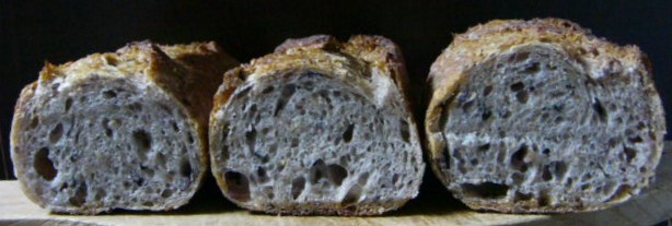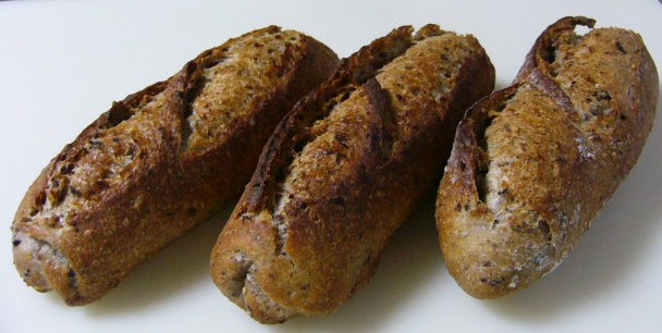 パンは雑穀カンパーニュ。いつも作っているワンパターンのレシピですが、今回は三分割し、細長く成型しました。
