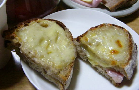 スライスしたカンパーニュの間に、 のハムとオニオンをはさむ。一番上にとろけるチーズを乗せてトースターで5分焼いただけ。