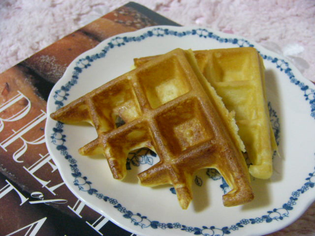 だけど以前、いろんな配合の生地をワッフルメーカーで焼いてみたことがありました。ホットケーキミックスの袋に書いてあるとおりに作ったホットケーキの生地とか、牛乳を多めに入れたヤツとか、小麦粉とBPで適当に作ったヤツとか。結果、どの生地でもOKでしたよ。それぞれによかったです。それ以来、ワッフルに関してはすっごくアバウトに考えるようになっちゃいました^^;