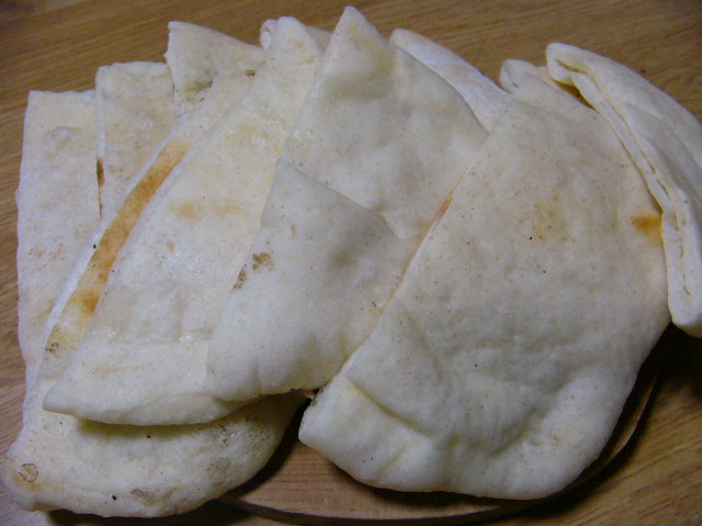 フライパンで焼いたふくらまなかったピタを、どうしようもなくてそこらへんに転がしていたら、ダンナが見つけてパクリ。