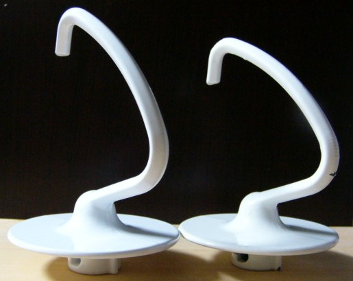 古いほうは、キッチンエイドを買ったときについてきたもので、かなり使い込んだせいか、でっぱったところの塗装がはげちゃってました。画像でも、右端の曲がったところの塗装がはげてるの、見えるかな?上部のカーブのところもはげてます。