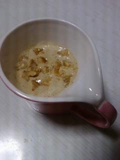 リコッタチーズ(この辺じゃ見かけないように思います。お姉ちゃんが言ってたとおり、カッテージチーズで代用)を、インスタントコーヒーや砂糖で味付けしてふわっとさせ、上に好きなものをトッピングする、というもの。