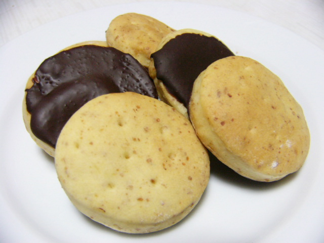 チョコにつぶつぶが見えるのは、グラニュー糖です。チョコはエクストラビターと袋に書いてあるとおり、甘さはかなり控えめだったんです。それで勝手にチョコにー糖を混ぜました。それでもまだまだビターな感じです。ビスケットの方も甘さ控えめです。