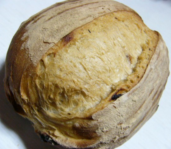 底画像で、少しですが底が割れてるっぽいですし、クープもなんつ~か、下火の強さで無理やり開かせちゃったというか、実はなんとかマシに写る角度を見つけて撮影しただけで、あまり開いていません。一応開いた手前は無理やりめりっと開いているし、向こう側はあまり開かない。こういうのは、鍋のせいじゃなく、醗酵の問題だよね。少しだけど具が入ってて、見極めがうまくいかなかったんだと思います。