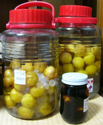 なんだかピンボケ画像になってしまいましたが、手前のが梅ジュースです。仕込んでから4日経過しました。だいぶ水分が出てきた感じです。