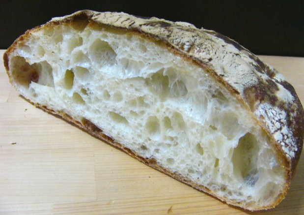 でも、この本のレシピはちょっと違います。水分が多いのは他のレシピと同じですが、これはしっかりこねる・でっかく焼く・油脂も入るというところが特徴的。成型は、両手で大きな生地の塊をぐい~~ん!と左右に伸ばすんですよ。さらに、生地にぶすぶすと穴を開けます。焼成の直前に、生地をひっくりかえしてもう一度ぶすぶすっとやるんですな。