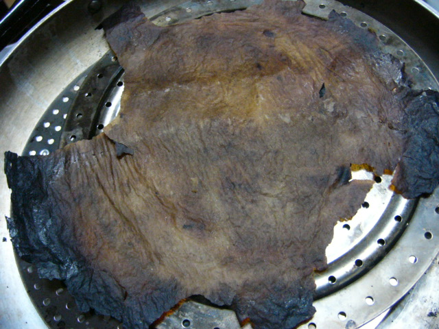 ちなみに、オーブンで使い続けると、真ん中から黒くなってきて、真ん中に穴ができたら捨てます。鍋だと、やっぱり鍋肌からの火力が、オーブンペーパーの端っこから焦がしていくようで、画像のような姿になるんですよね。