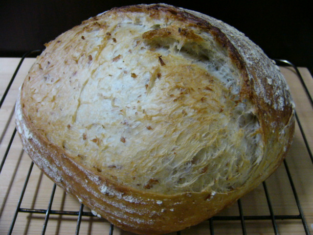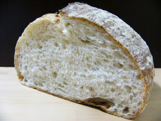 捏ね上げ温度27℃、そのまま1次発酵に入り、オーバーナイト。朝8時ごろパンチして数時間で1次発酵終了、あとはいつもどおりに焼きました。