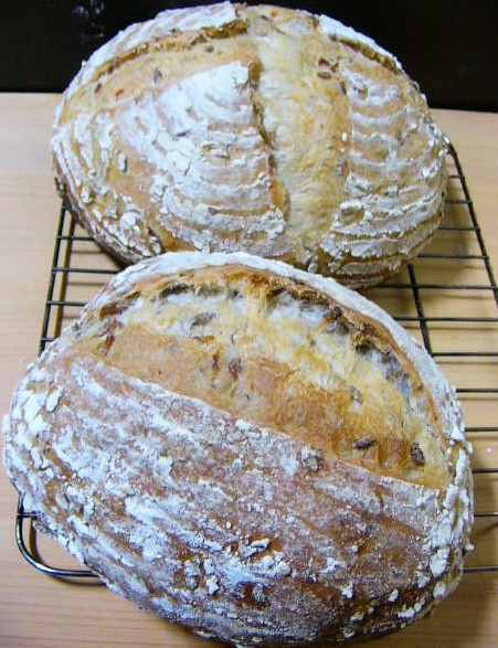いつもはオバール型の発酵かごに入れるのですが、ライフレークが多かったために生地のカサが多いに増したので、ひとつはいつものオバール型、一つは大きめの丸型に入れました。