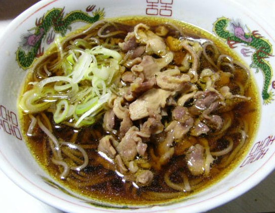 山形県河北町の名物そばで、ダンナがお店のまねして作りました。欠かせないのは親鳥。これでしっかりダシとって、ちょっと甘めのつゆに太目のそばをあわせます。ちょっとこってり目なのがよいです♪