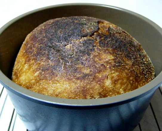 さて、生地を丸めて放り込んだらすぐに250℃に予熱したオーブンに入れる。はじめの35分が過ぎたら、鍋ごと取り出して上の鍋を外してまた15分焼く。