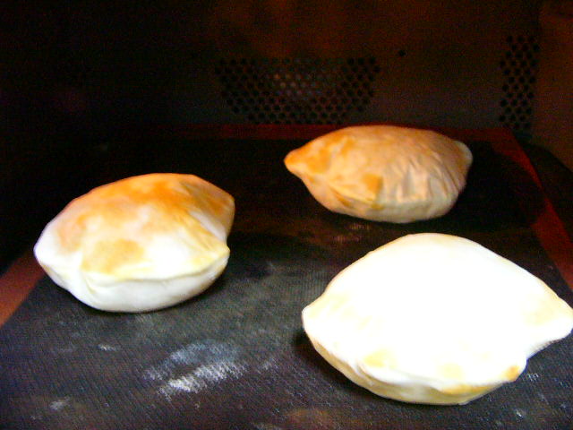あと、e-pan工房さんによると、生地は硬めにすること、生地をのすときは、ギザ麺棒はダメ、とあります。この教えを守って生地を作りました。配合は、レシピというほどのものではなくて、4個分としてイーグル80gに60%の水を入れて塩を一つまみ入れて不真面目にこねこねし、一呼吸置いたら薄く延ばして焼くだけ。イーストパンのカテに入れたけど、ほんとはイースト使ってません。