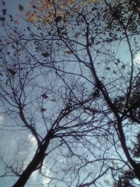 落葉した木々に残る葉っぱ。逆光でわからないけど、紅葉してます。