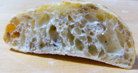 いや~すっごく扱いにくい。水分量は前のと同じで80%ぐらいなんだけど、ライフレークがグルテンのつながりを切ってしまうのか、打ち粉を真冬の雪のように大量に使ってもとても大変。レシピの工程に、生地を2回ひっくり返すというのがあって、1回目はこんじょ~で返したけど、2回目はもう生地が崩壊しそうであきらめました。