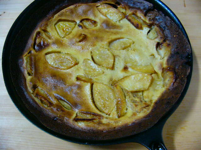 鉄のフライパンで砂糖をまぶしたリンゴをソテーしてから、パンケーキの生地を流し込み、ダンナが食べたいといっているパンケーキのイメージに近づけるように、フライパンを回して、生地をフライパンのふちにもつけ、予熱したオーブンにフライパンごと入れて焼く、見たいな感じにしました。