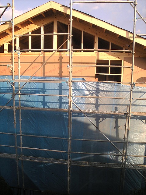 今週初めに足場が出来、半ばに柱が立ち、昨日は屋根が出来、今日は壁や床を作っているようです。