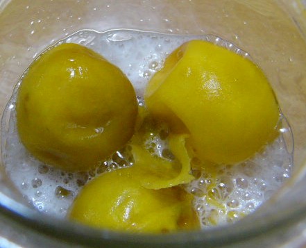 ジュースが出来上がる頃には、ジュースは泡だらけです。従いまして、出がらし梅も、そのジュースをどっぷり吸っております。シワシワではないです、発泡しているので、ぱんぱん!
